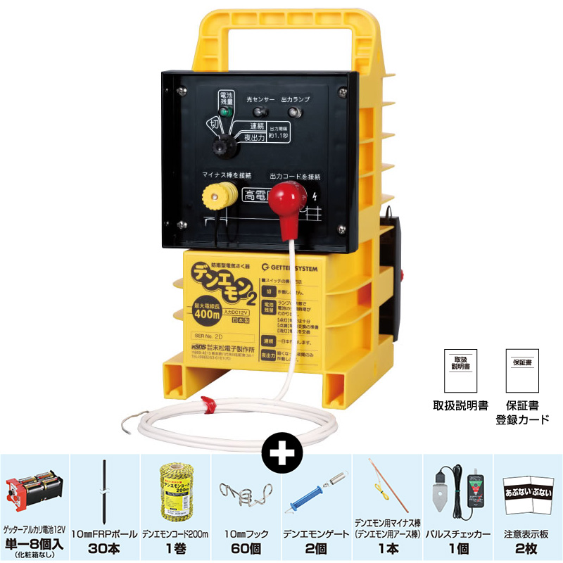 | セット内容 | デンエモン2、ゲッターアルカリ乾電池12V(単一形8本入り)、10mmFRPポール(30本)、デンエモンコード200m(1巻)、10mmフック(60個)、デンエモンゲート(2個)、デンエモン用マイナス棒(1本)、パルスチェッカー(1個)、注意表示板(2枚) |