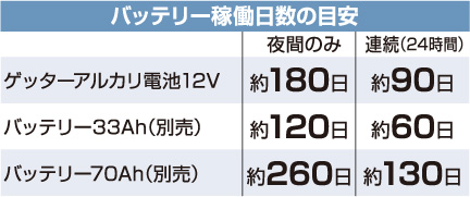 電源は単一形アルカリ乾電池8本(付属)で最大約90日(連続)、夜間のみの設定で約180日作動。