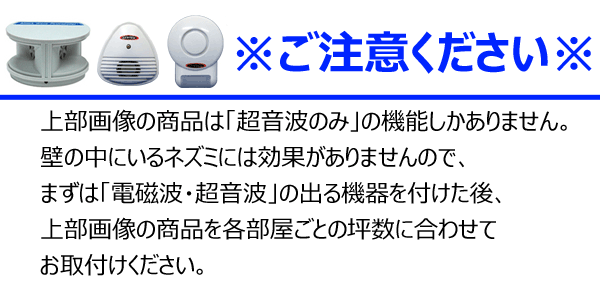 | ペストコントロは、超音波・電磁波でネズミにとってイヤな環境を作り、ストレスを与えますが、効果が表れるまで、時間が掛かる場合がございます。(1週間〜2ヶ月程) すぐに追い出したい方は、最初にくん煙剤等でネズミを強制的に追い払う事をおすすめします。 くん煙剤が使えない場所には、設置型の忌避剤や忌避スプレーをネズミの居る場所や被害のあった場所に使用してください。 ペストコントロの効果が表れてくると、ネズミが巣から逃げ出し、室内に出てくることがあります。その場合は、忌避剤・捕獲器等を合わせてご使用ください。 |